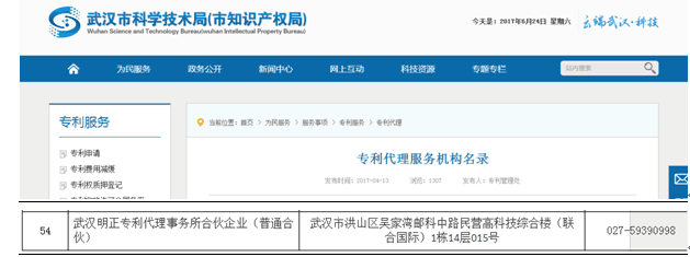 如:小編在網(wǎng)上搜索到一家代理機(jī)構(gòu)的名稱為“武漢明正專利代理事務(wù)所”,我想確認(rèn)這家企業(yè)是否為國(guó)家認(rèn)可的專利代理服務(wù)機(jī)構(gòu),小編進(jìn)入“武漢市科學(xué)技術(shù)局”,查詢?nèi)缦拢?/span>
